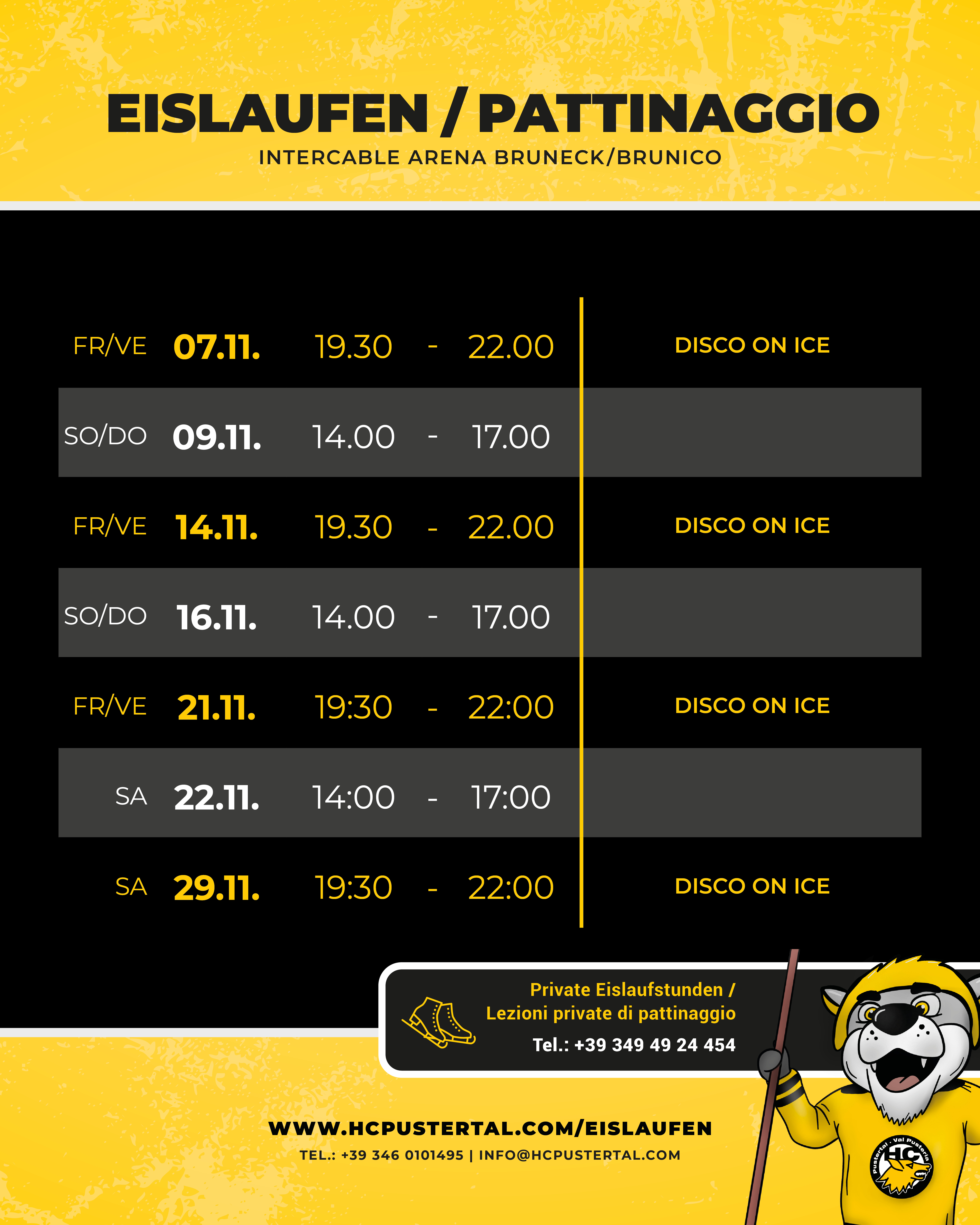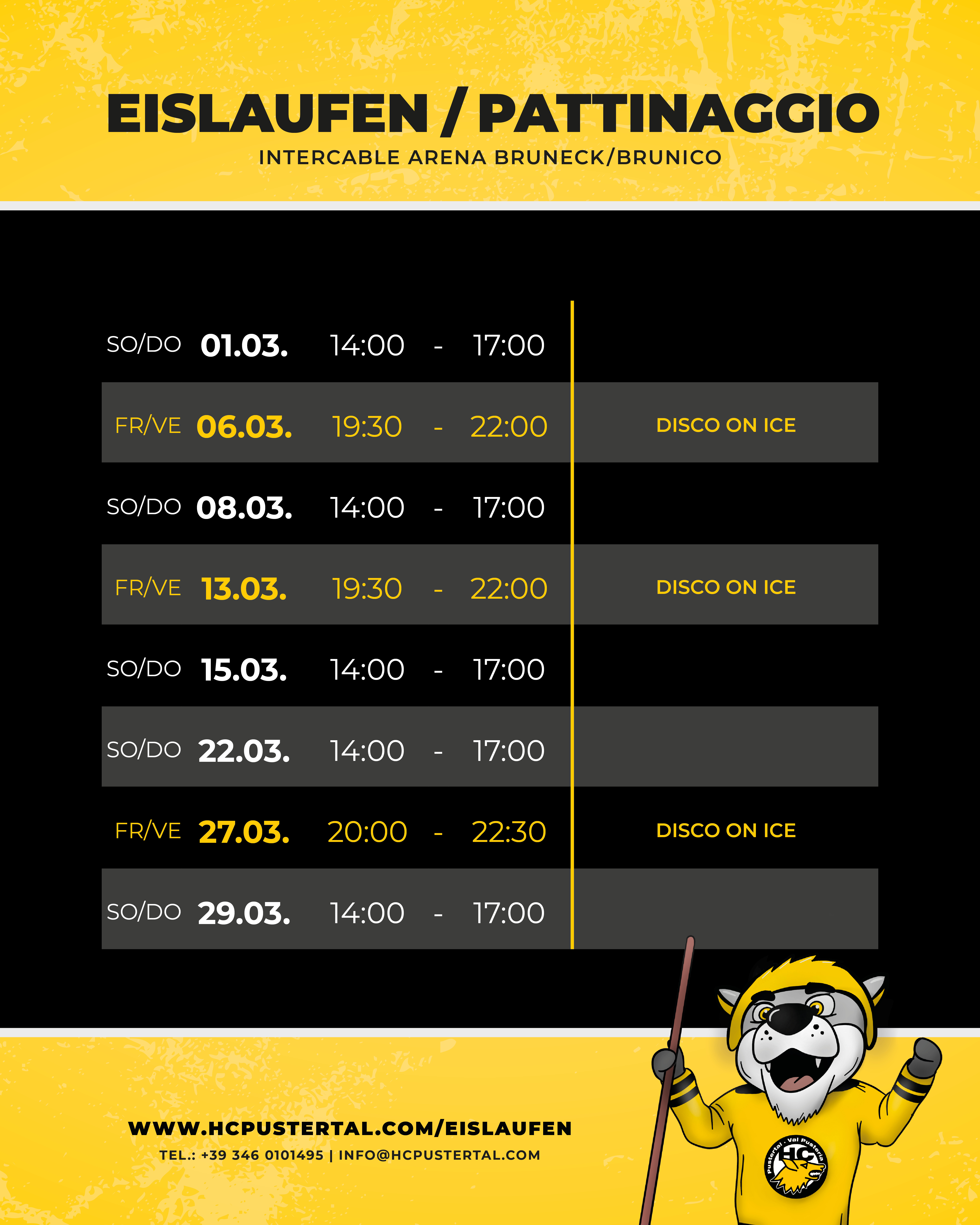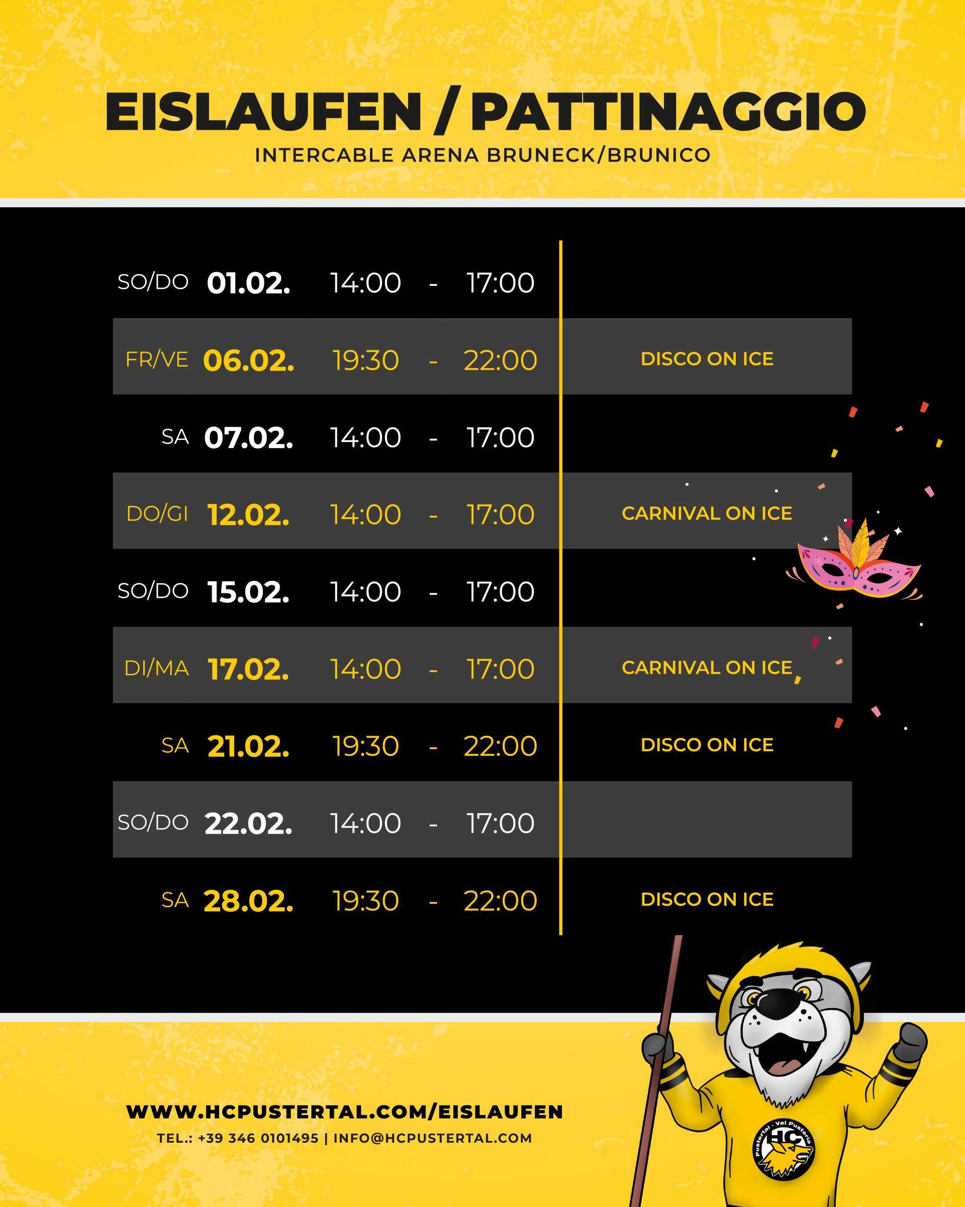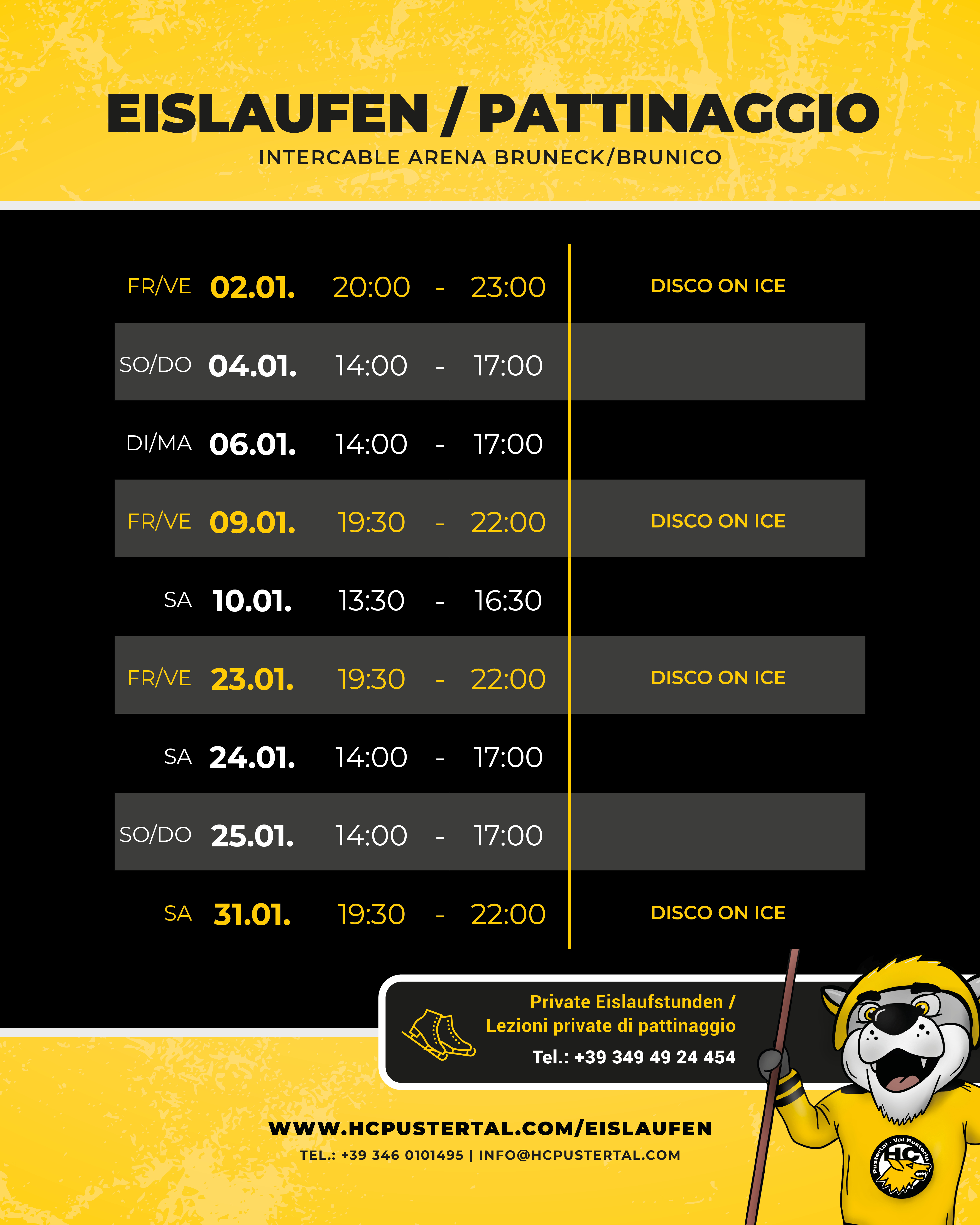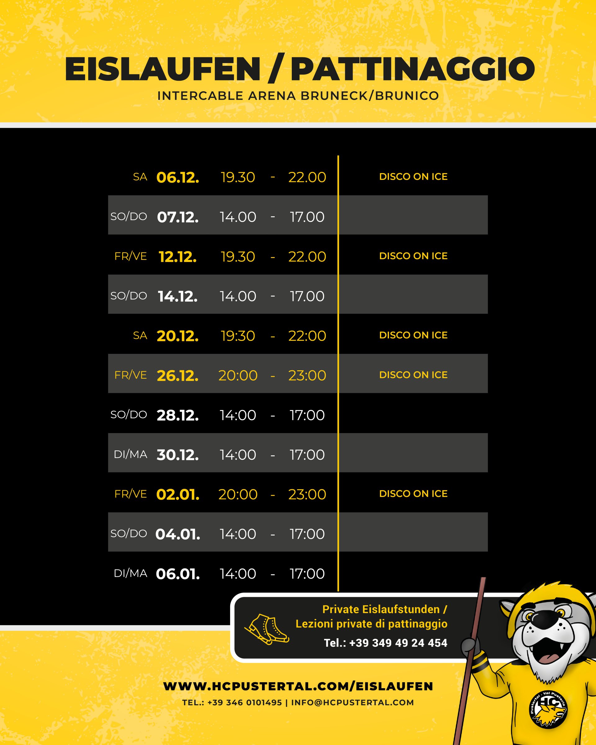 La coloratissima DISCO ON ICE gode di grande popolarità tra grandi e piccini. In determinati giorni, l’HC Val Pusteria trasforma l’Intercable ARENA in un mare di colori. La musica diffusa dagli altoparlanti assicura una stimulante atmosfera. I prezzi d’ingresso sono gli stessi del pattinaggio pubblico, e il servizio di noleggio pattini è ovviamente aperto anche di sera.