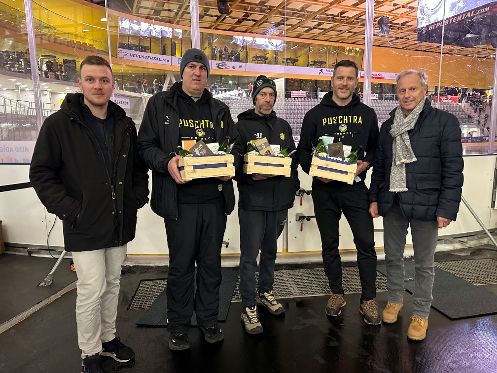 I tre addetti del ghiaccio dell'HC Val Pusteria si distinguono per l'elevata professionalità, la grande affidabilità e l'instancabile impegno. Pertanto, alla fine dell’anno il presidente della BRUNICO AKTIV Srl, Alfred Valentin, e il responsabile dell'ARENA, Tobias Hitthaler, hanno consegnato loro un segno di riconoscimento per il prezioso lavoro.