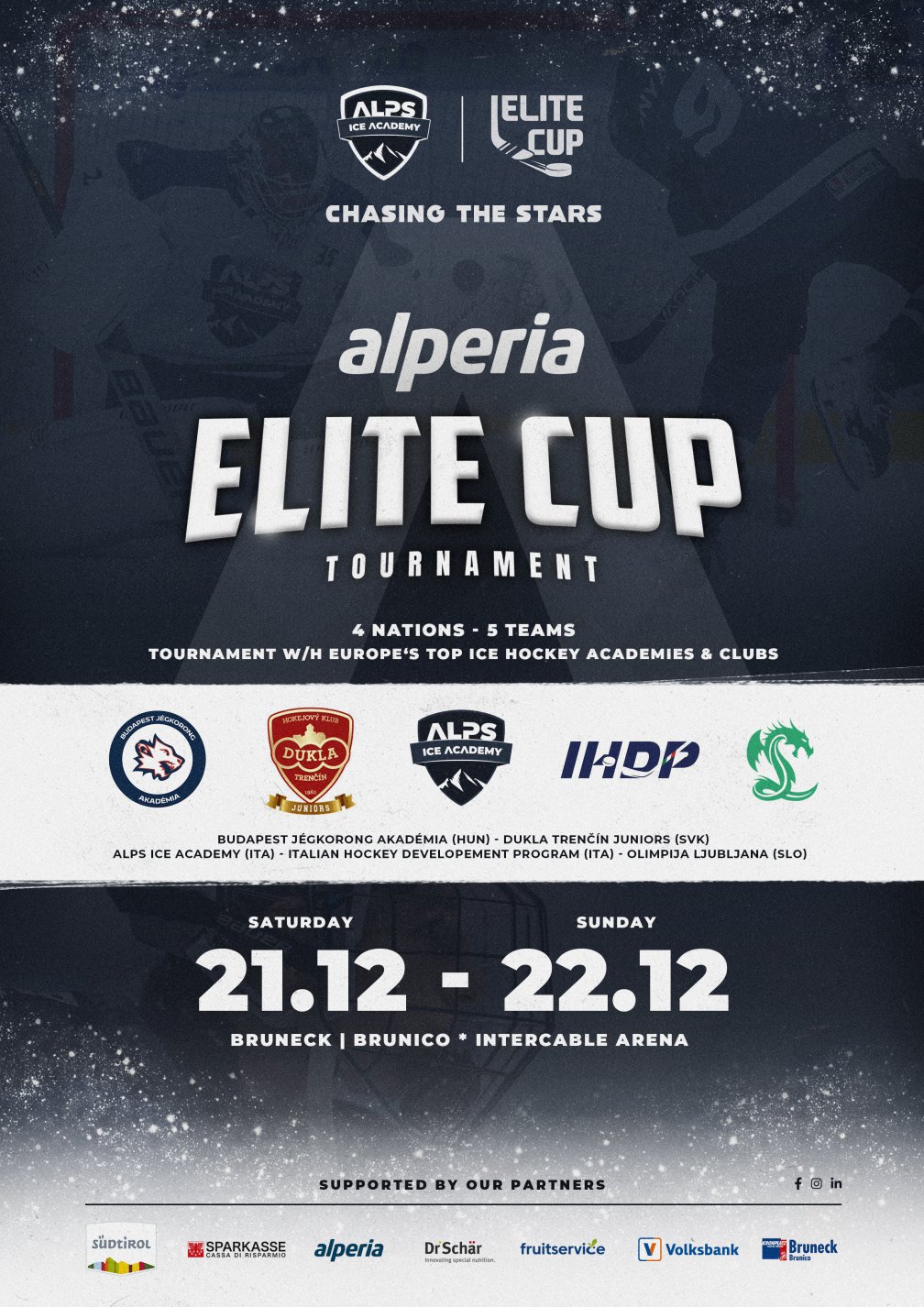 L'Alps Ice Academy parteciperà al torneo contro le migliori squadre giovanili europee provenienti da Italia, Slovenia, Ungheria e Slovacchia. Le partite si svolgeranno su entrambe le piste, si giocherà in due tempi da 20 minuti ciascuno. L'ingresso è libero.
